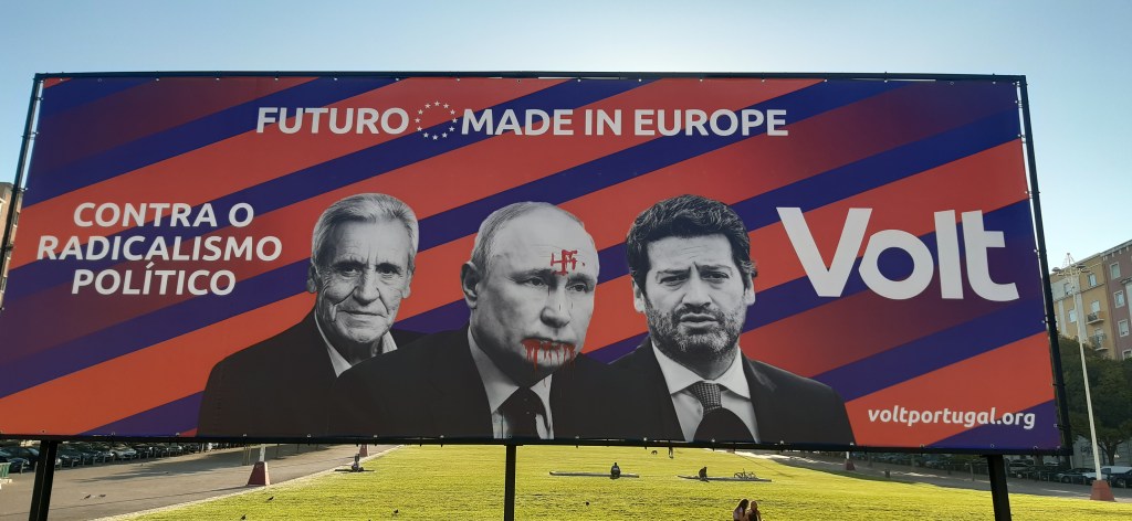In the billboard above, Volt professes its pro-Europeanism (“Future made in Europe“) and its disgust towards what they call “political radicalism“. This radicalism is represented by both the far right (André Ventura) and Communism (Jerónimo de Sousa), showing that for Volt any ideology is intrinsically wrong. Symbolically, it is important to note that between the two ideological extremes, Volt puts Vladimir Putin (the blood in the billboard has been added by some people as situationist déteournement perhaps). The message is: *every* ideology is the evil incarnated.