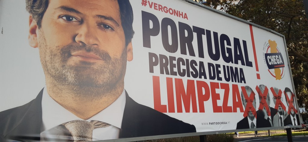 To understand the evolution of right-wing parties in Portugal, I started looking at the billboards spreading across Lisbon and learned some important lessons. Let’s start from one of the biggest surprises of Portuguese politics in the last years: Chega (Enough), the first populist radical right party to enter the Portuguese parliament. Its leader is André Ventura, a former football commentator with a degree in Law, who wanted to become a priest but ended up leading the Portuguese radical right. Chega entered the parliament in 2019, a few months after its creation, with only one deputy: Ventura himself. After the 2022 snap elections, it became the third most voted party and it can now count on 12 MPs.