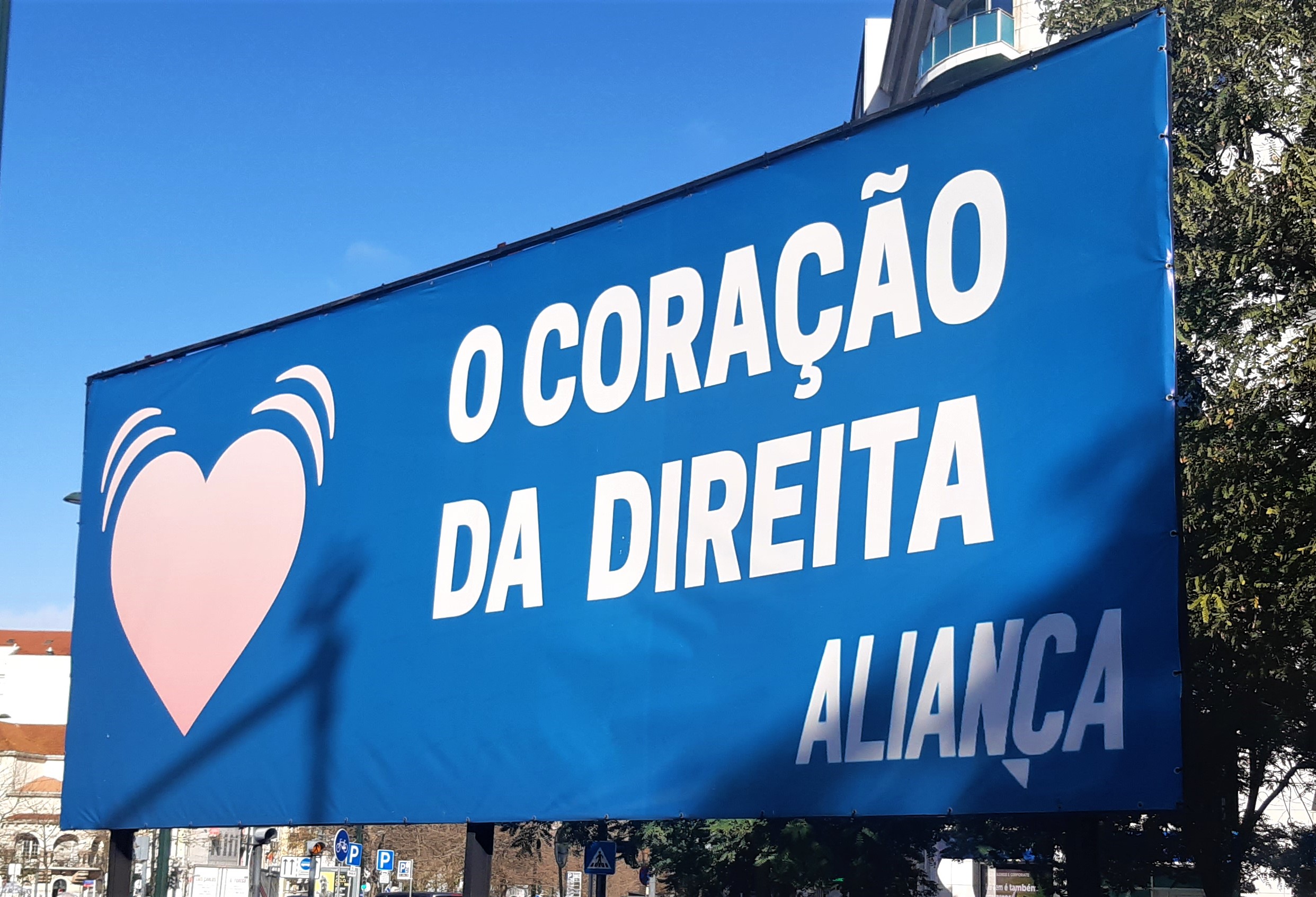 Let’s move to another challenger: Aliança (Alliance). It was created as a splinter of the mainstream right (PSD) in 2018. Its creator and first leader was Pedro Santana Lopes, Prime Minister between 2004 and 2005 as well as former PSD president. So far, Aliança has failed to become “the heart of the right” (as the billboard below claimed).
