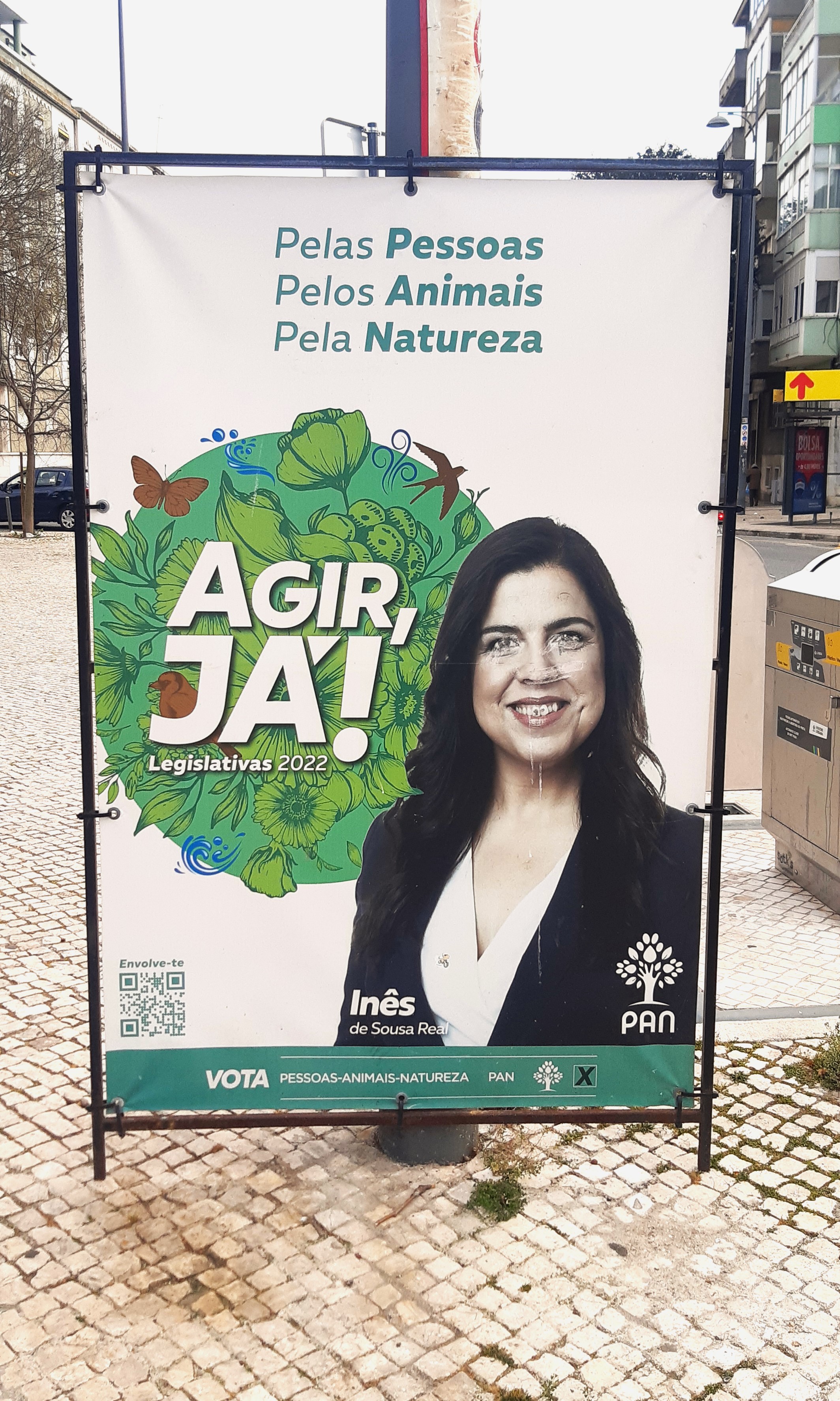 The main problem is the lack of a clear program and of an identifiable ideology, which might be reflected in the colour palette chosen for the billboards (white, green, blue contrary to the red and purple of most other left-wing billboards). It is interesting to note that PAN’s former MP, Cristina Rodrigues, became Chega’s parliamentary advisor in 2022. Rodrigues left PAN in June 2020 and is now a Chega militant. Alas, this is a common fate for parties that are “neither left nor right”. Moreover, beyond bullfights, I could not see any PAN billboard with a political message, which might reflect the party’s ideological flexibility (reminding me of the Italian 5 Star Movement). The only exceptions were these two billboards. One generically says: “For people, for animals, for nature. Act now!”. The other says: “If nature is your cause, PAN is your party”.
