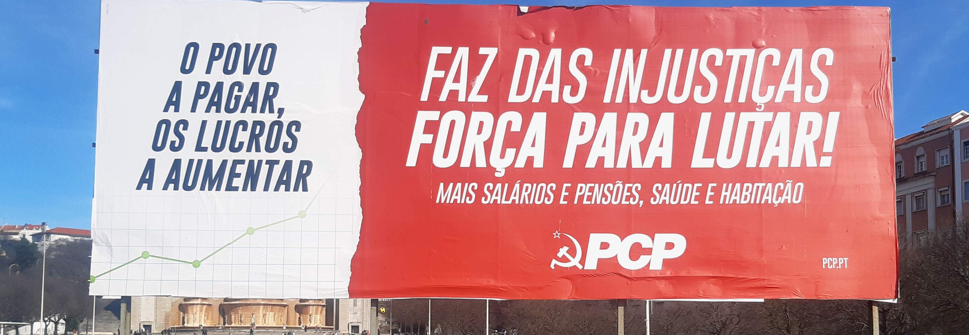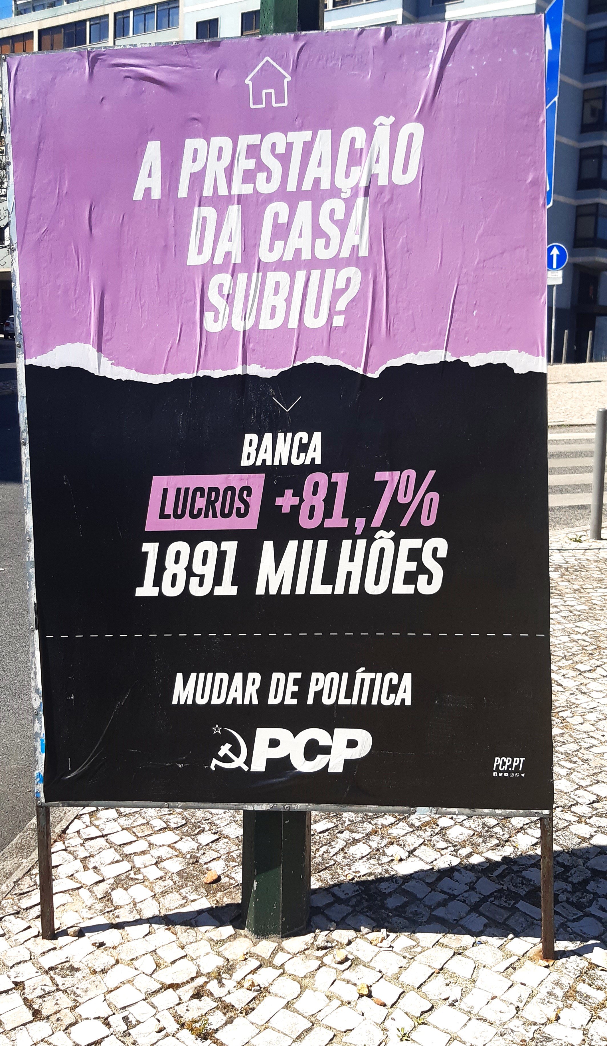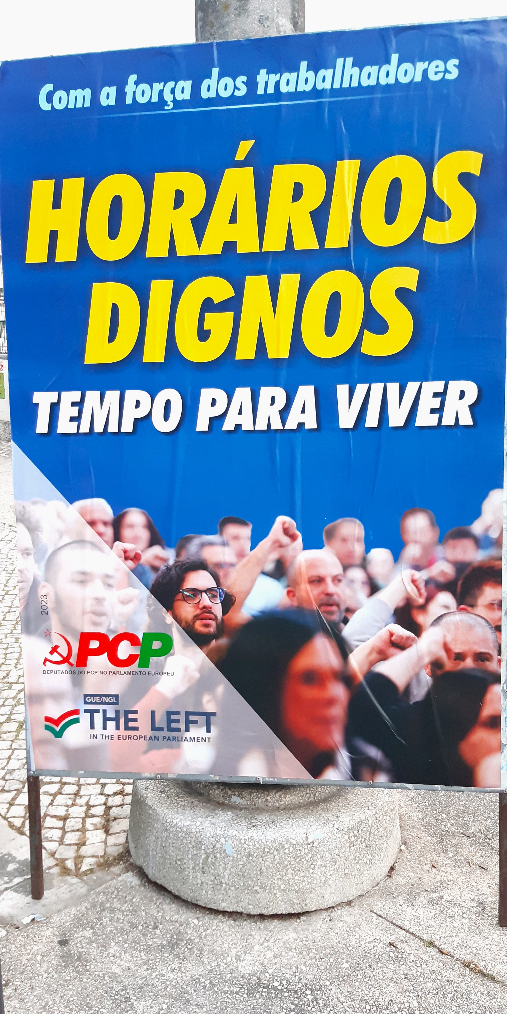 The party is both immutable, in its orthodox Marxist–Leninist political line that brought them to *not* condemn the Russian invasion of Ukraine in 2022. At the same time, PCP is changing rapidly because the leaders are increasingly born-and-raised intellectuals rather than working-class people with manual labour experience. The party’s focus, though, remains on workers. Their billboards across Lisbon cover topics similar to those covered by the Left Bloc: the profit of banks and big corporations against the interests of the common people (workers), the housing crisis, the necessity to raise salaries and pensions, and the fight against precariousness.