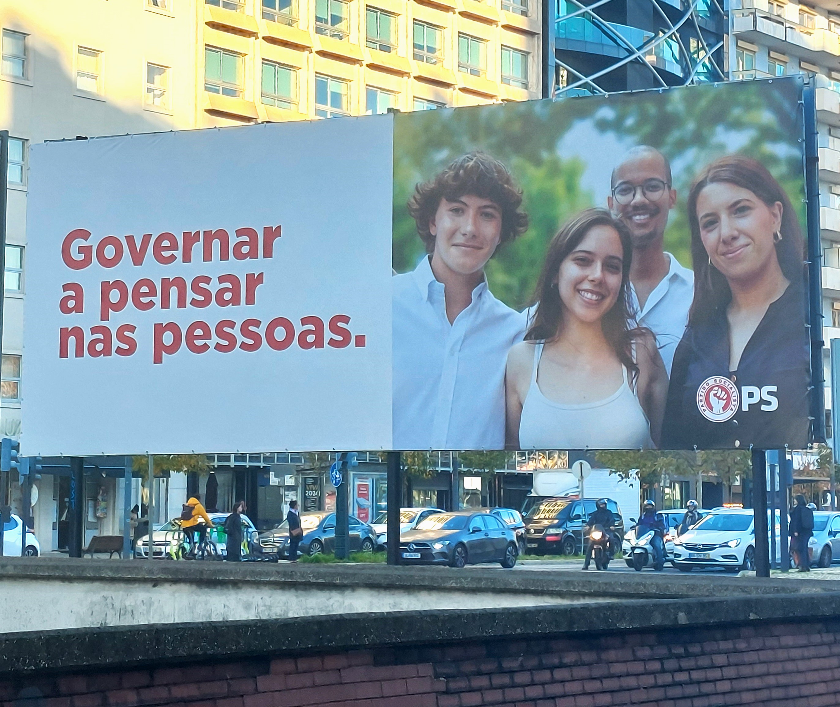 One of the party’s billboards, form before the November corruption scandal, portrays the former leader António Costa hugging someone, presumably a supporter, showing the strict contact between PS and “the people”. The slogan reinforces the message: “Governar a pensar nas pessoas” (Governing with people in mind). In another example of the party’s demoticism (closeness to ordinary people), a poster shows a diverse representation of “the people” (as pessoas). It is balanced in terms of gender, 2 men and 2 women, and it represents mostly young people, the electorate PS desperately needs to stay in power after the 2024 elections.